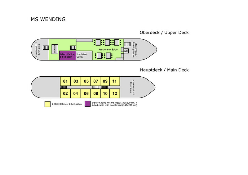 | Kabinenkategorie: | Hauptdeck 2-Bett-Kabine (2 ebenerdige Betten) | Oberdeck 1-Bett-Kabine (mit frz. Bett (140 x 200 cm)/ Einzelnutzung) |