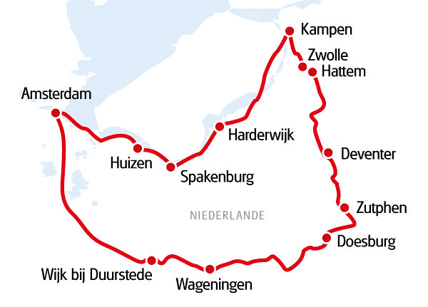 Heute beginnt Ihre Radtour in der Hansestadt Doesburg (ausgesprochen „Duusbürch“). Von hier folgen Sie der Hanseroute entlang der IJssel nach Bronkhorst, das stolz darauf ist, die kleinste Stadt der Niederlande zu sein. Ziel Ihrer Tour ist Zutphen, die Turmstadt. Schon von weitem sehen Sie die großen und kleinen Kirchtürme, die das Panorama der Stadt zieren. Während des Abendessens Schifffahrt nach Deventer. Der historische „Stadsplein de Brink“war schon zu Hansezeiten zentralerTreffpunkt in Deventer und bietet heute viele gemütliche Caféterrassen.